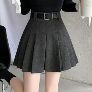 Vintage Winter Pleated Mini Skirt Women Streetwear High Waist Woolen Cute Skater Skirts With Shorts Belt Grey Black Skirt Woman