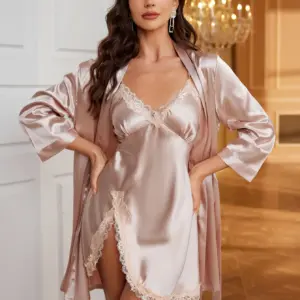 Hot-selling solid-color polyester nightgown lace see-through robe for women 2pcs set