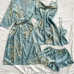 Summer irregular cherry print comfortable bathrobe and halter shorts sexy women’s pajama four-piece set